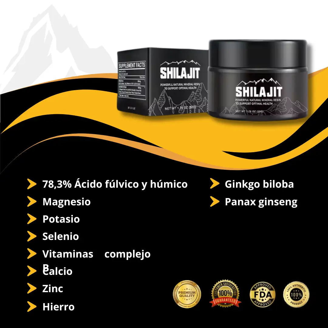 El shilajit es una resina natural que rezuma de las rocas de las cadenas montañosas de gran altitud, como el Himalaya y las montañas de Altai. Se forma a lo largo de siglos a partir de la descomposición de material vegetal y minerales. Rico en ácido fúlvico, minerales y otros compuestos bioactivos, se ha utilizado durante miles de años en la medicina tradicional, particularmente en Ayurveda, por sus propiedades estimulantes de la salud.